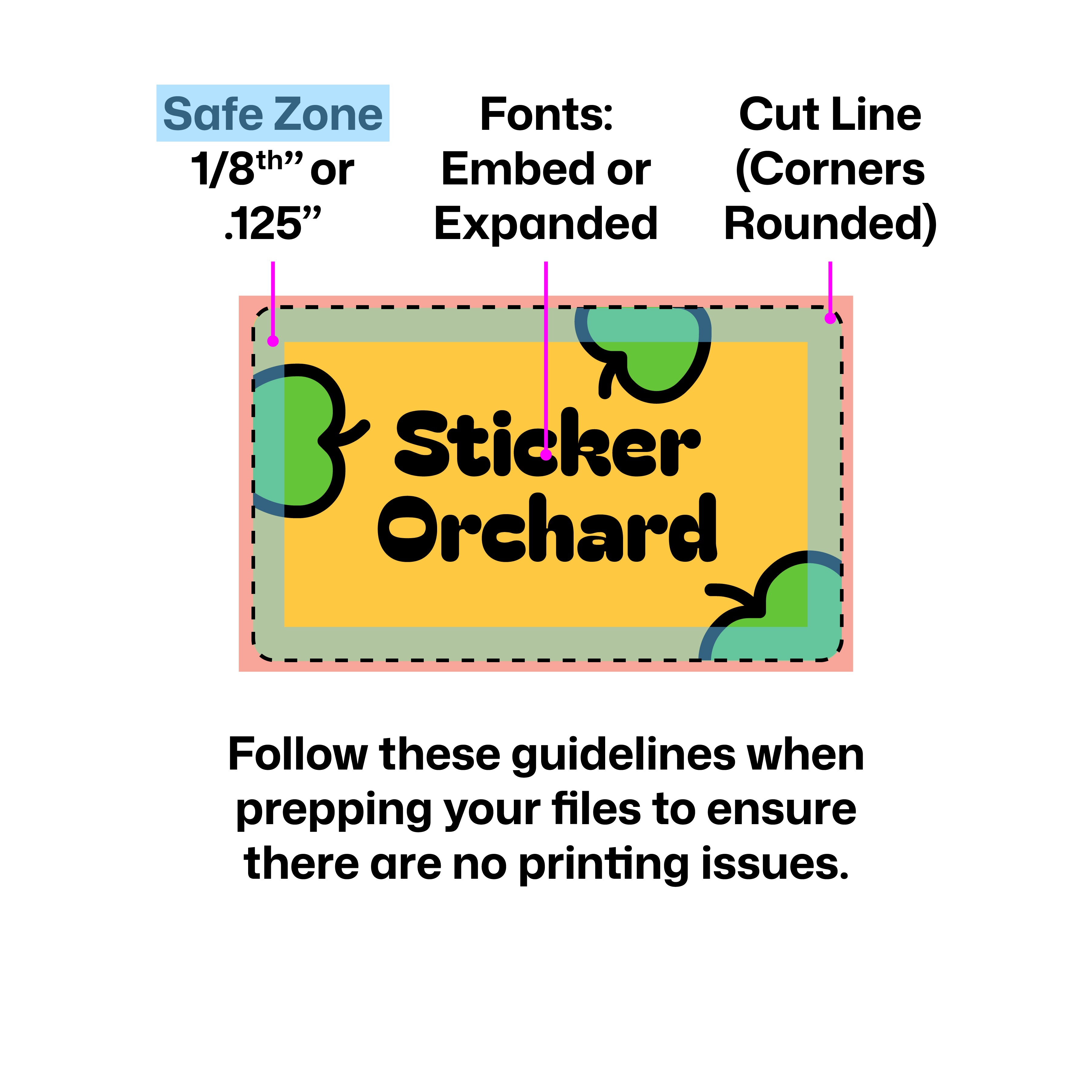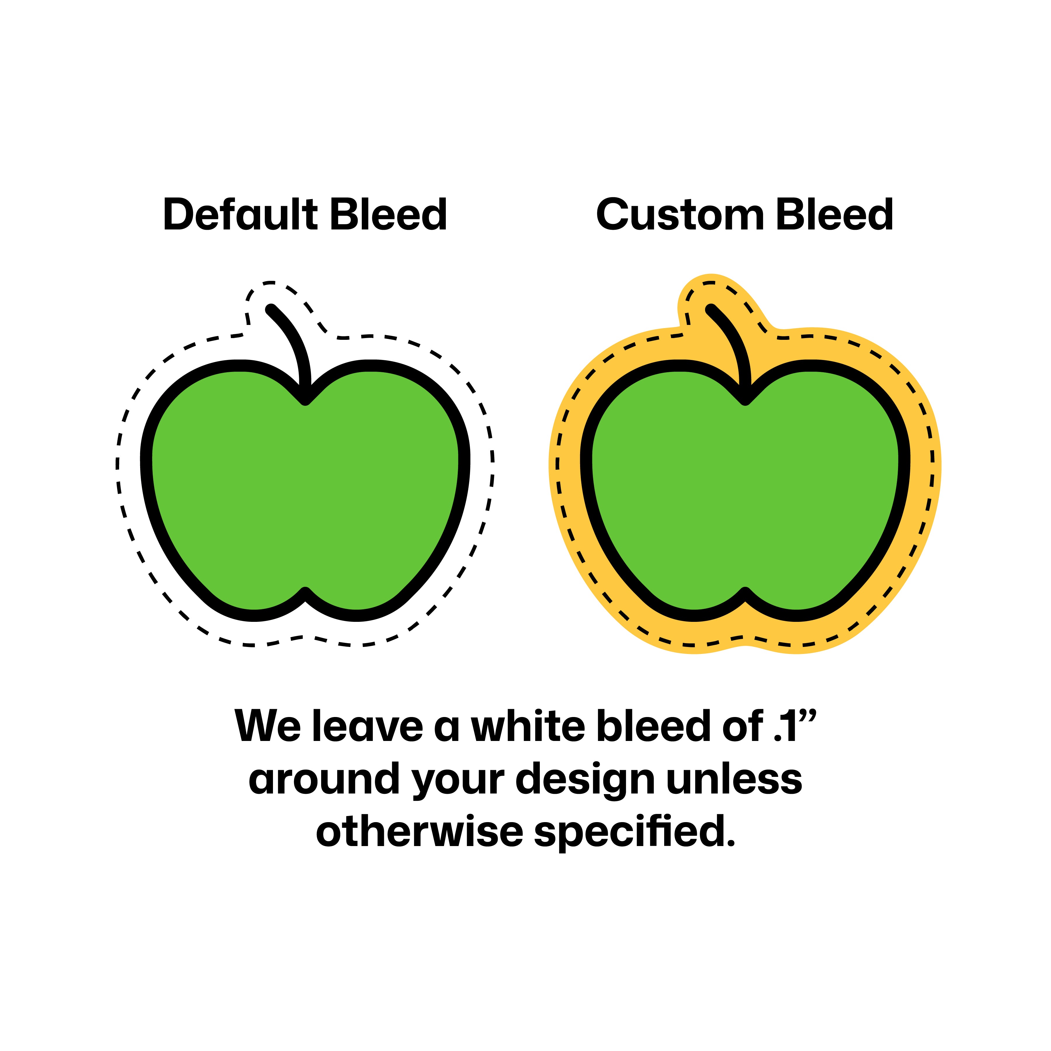 2. Bleed and Trim: By default, or stickers have an approximately .1" white border,. If you want your sticker to be full bleed, be sure to leave a bleed area that extends outside the cutline for your artwork. We recommend a bleed of 1/8" (0.125 inches).